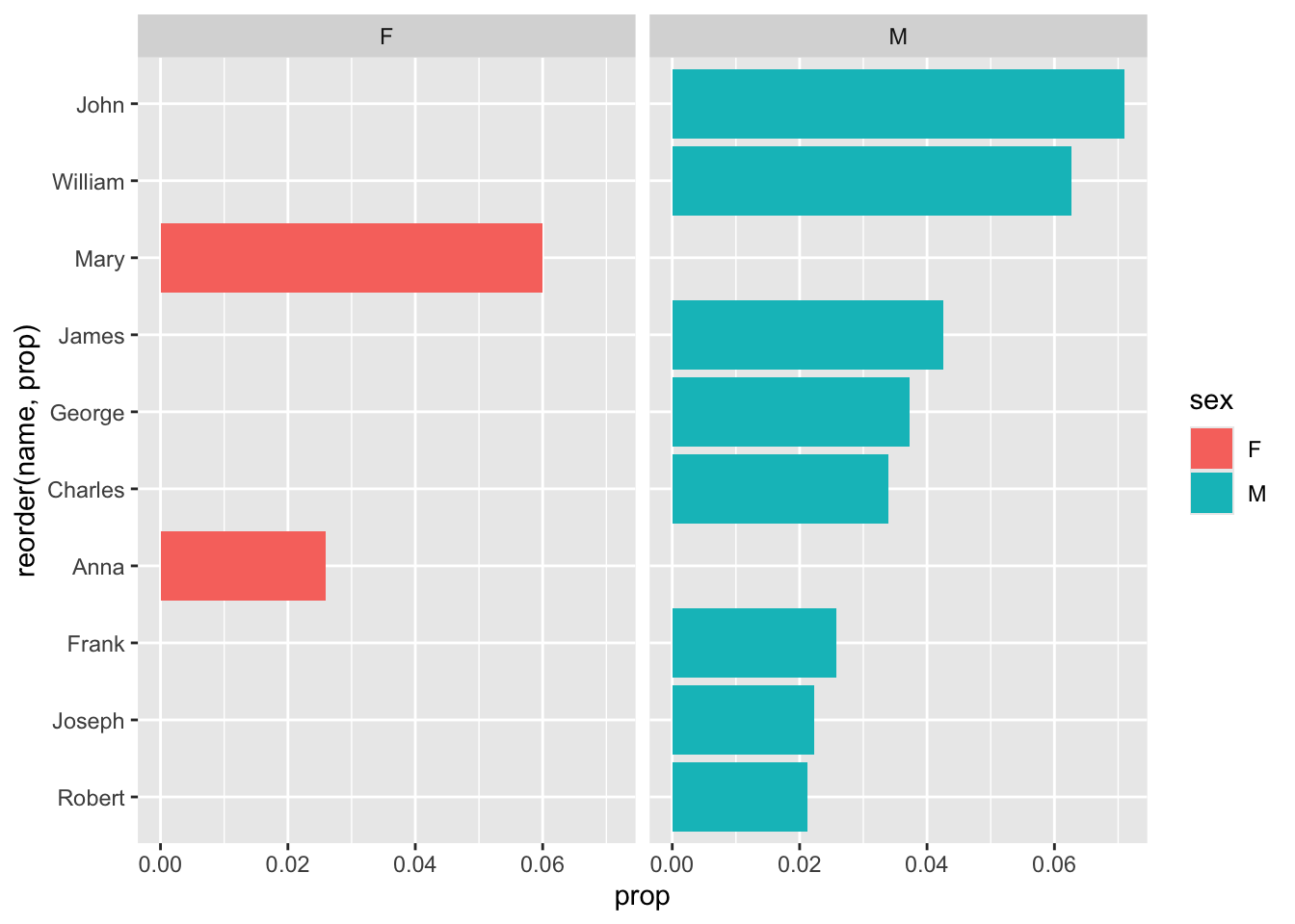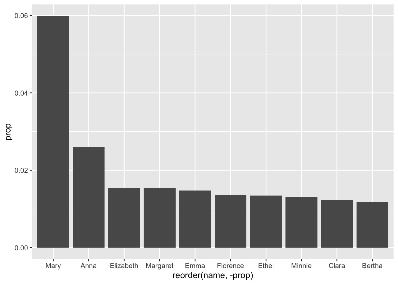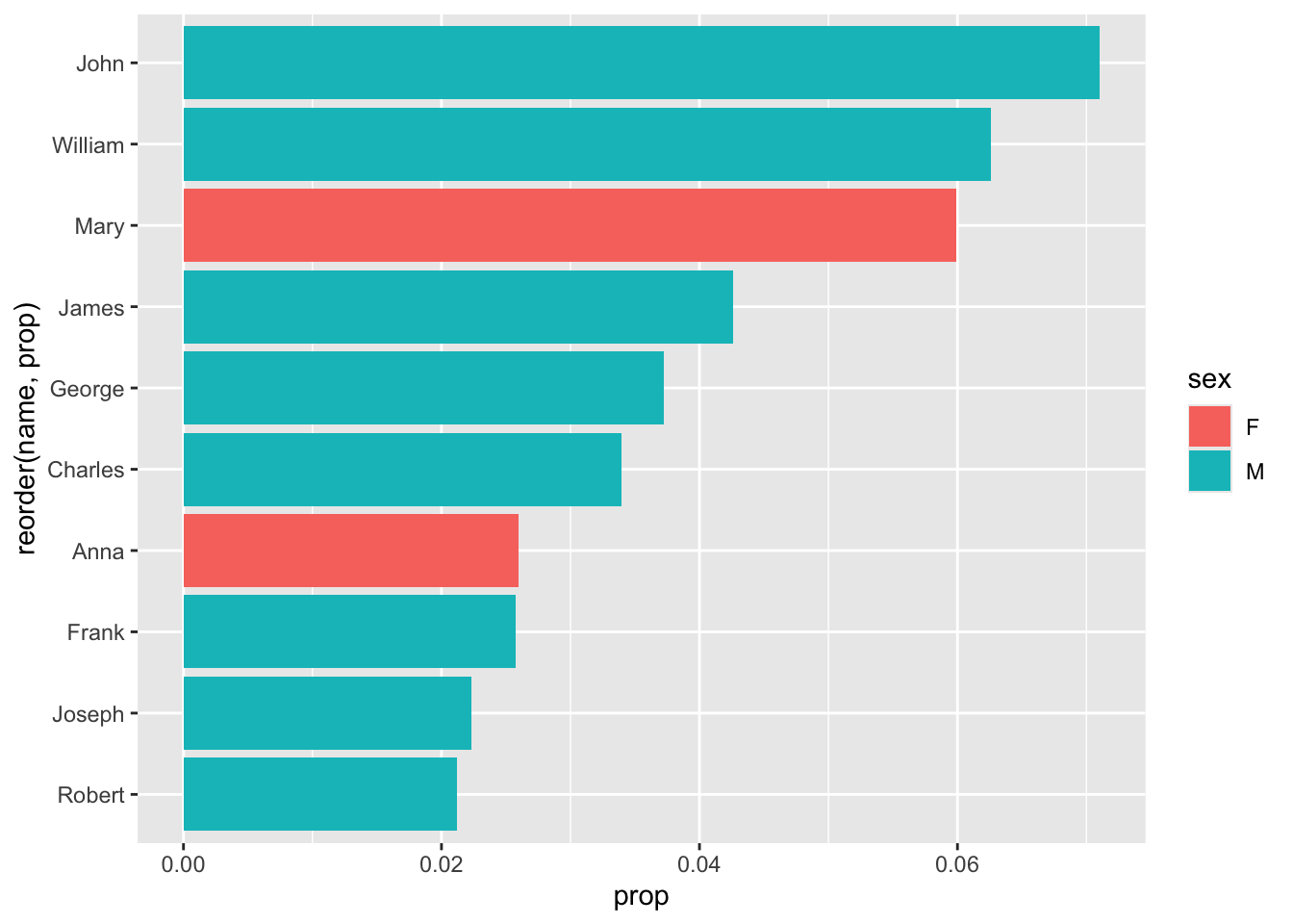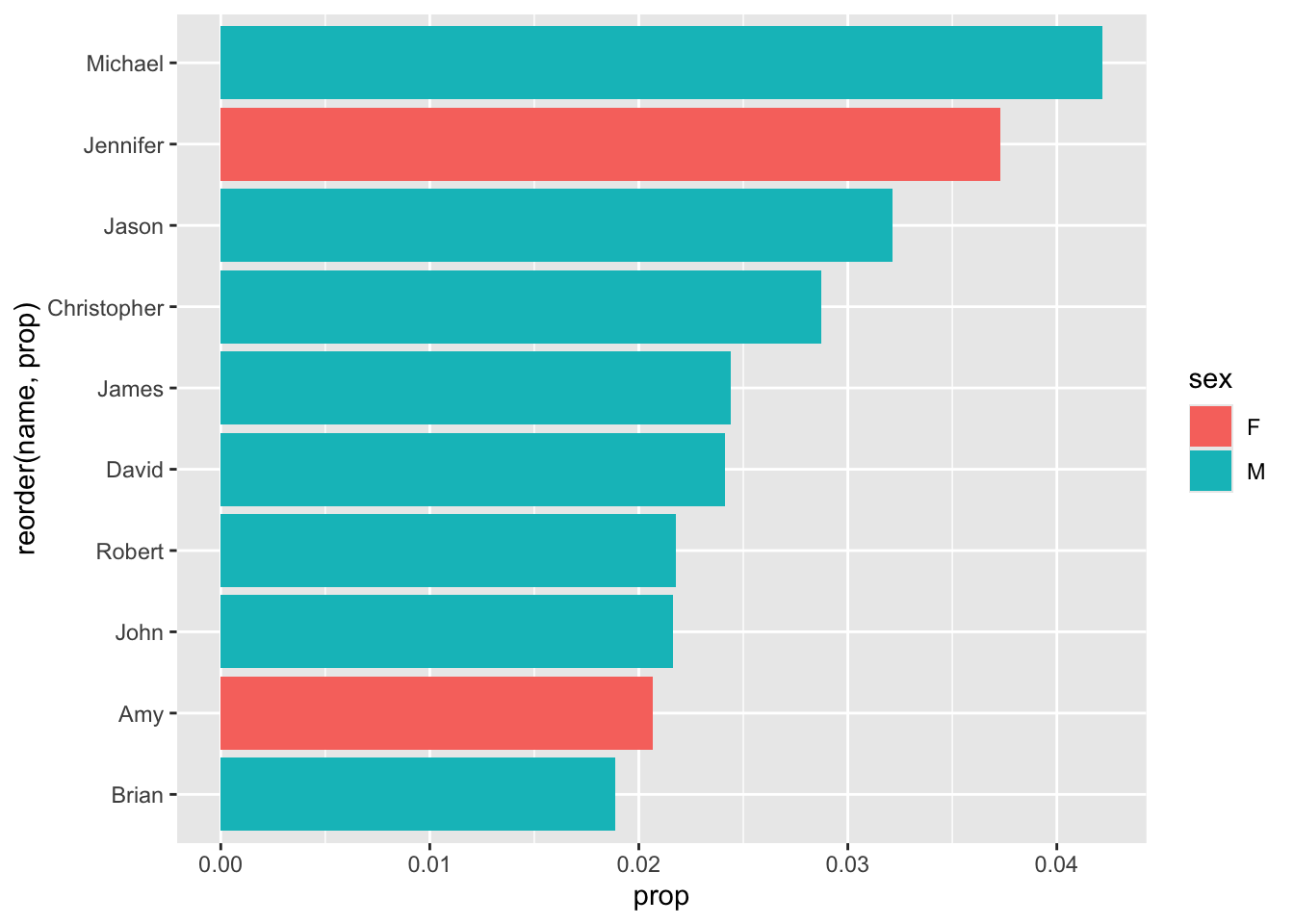 - We make sure to reorder the data (based on popularity, or ‘prop’) before limiting it to the top 10 results. Otherwise, it could be organized alphabetically or something - and we’d be getting 10 names, but not the 10 most popular names.