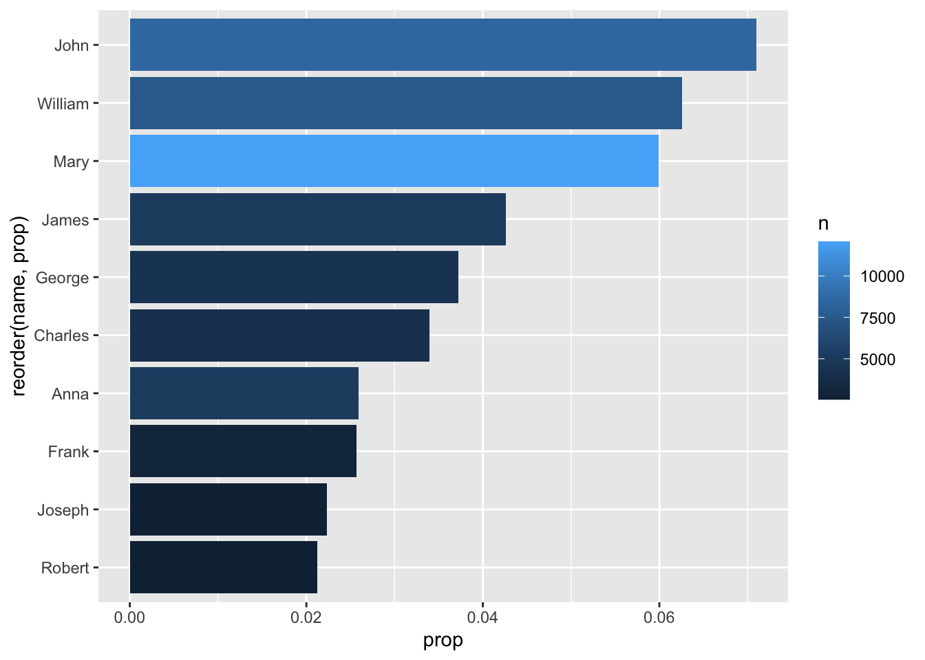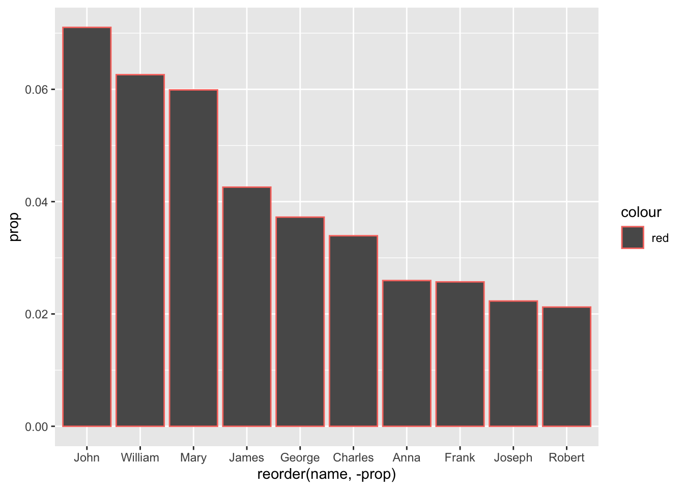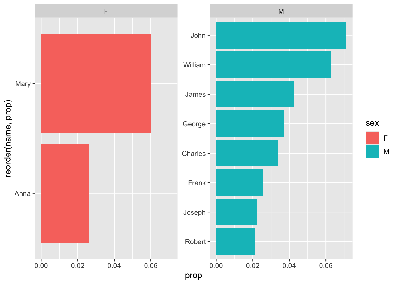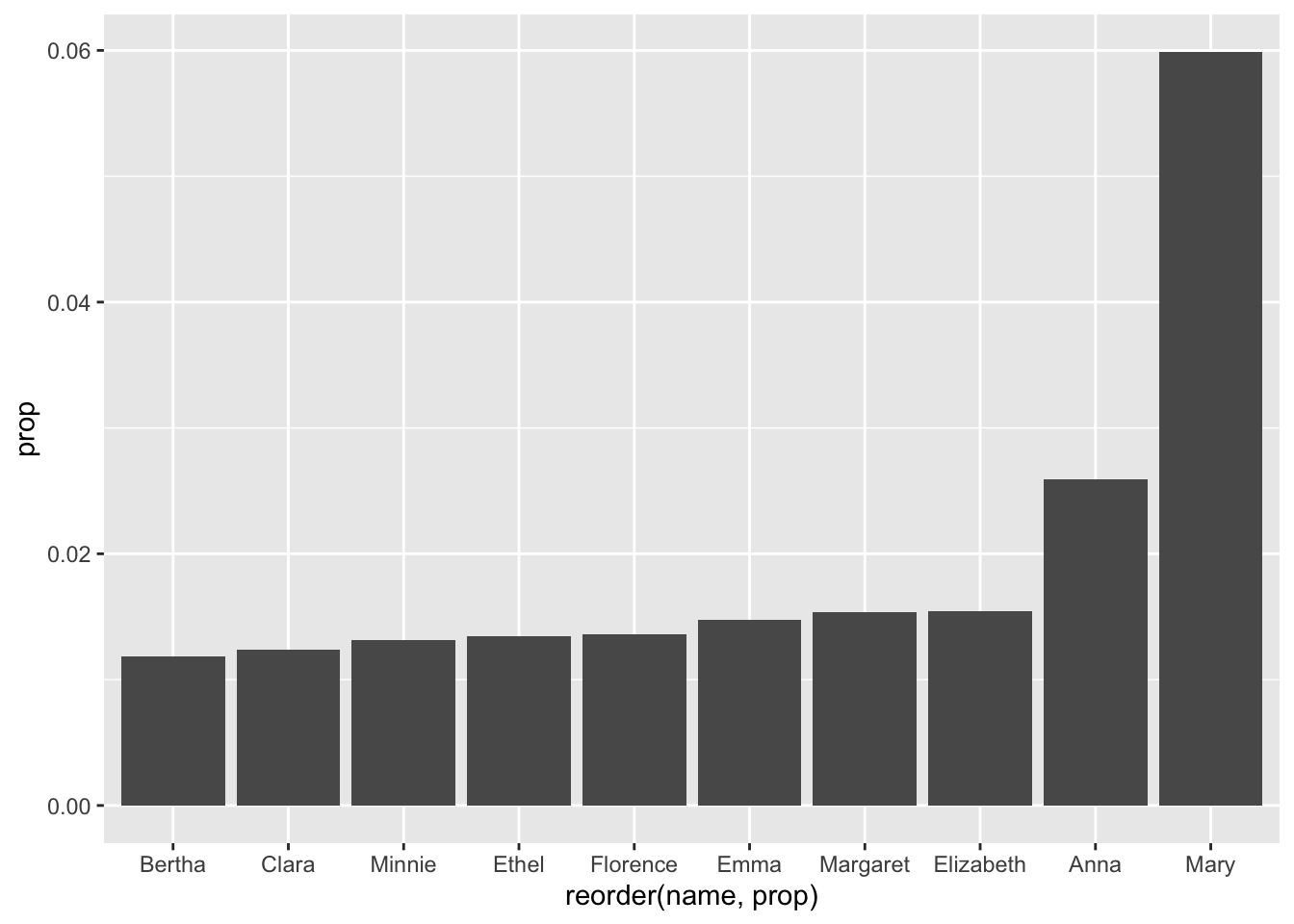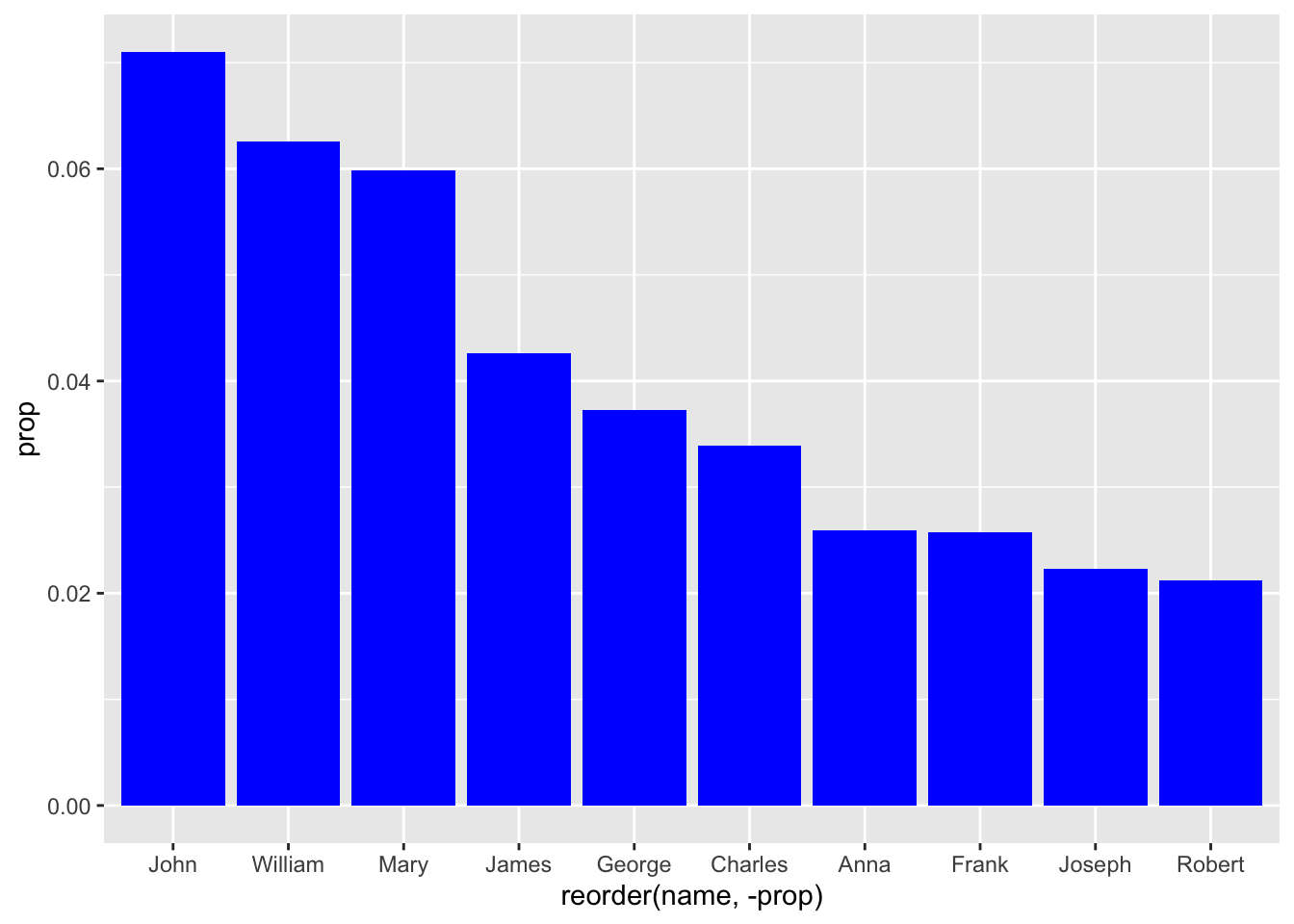 - We make sure to reorder the data (based on popularity, or ‘prop’) before limiting it to the top 10 results. Otherwise, it could be organized alphabetically or something - and we’d be getting 10 names, but not the 10 most popular names.
