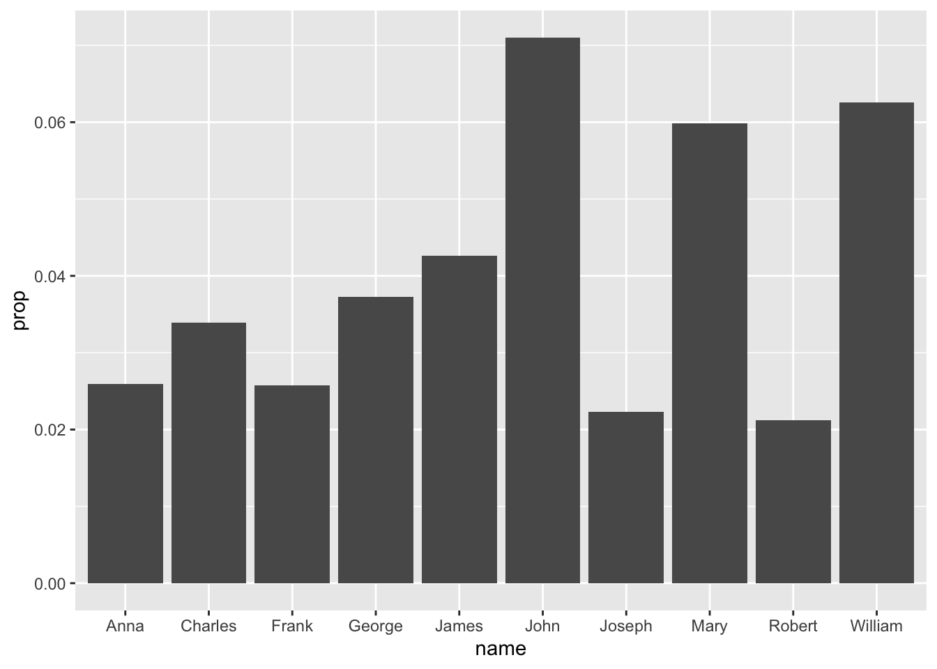 Why not a line chart like before? Because line charts only work with continous variables, like year. In this case, we are only plotting the data from one year, so year is no longer something we can plot. We are plotting name and prop, which are discrete variables.