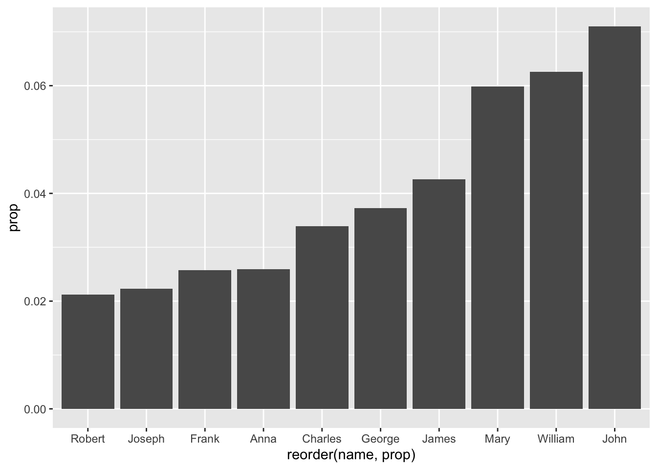 aes(reorder(name, prop), prop))