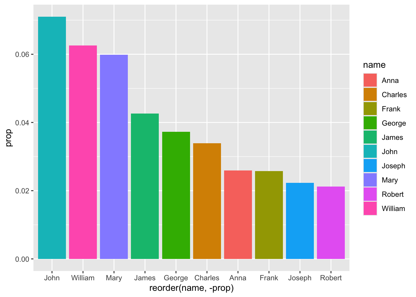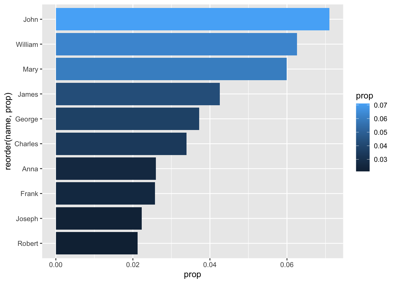 - We have to reorder our name variable in the ggplot() to go in order of prop - even though we just reorganized the data this way 2 steps ago, ggplot() uses its own internal logic to organize the data.