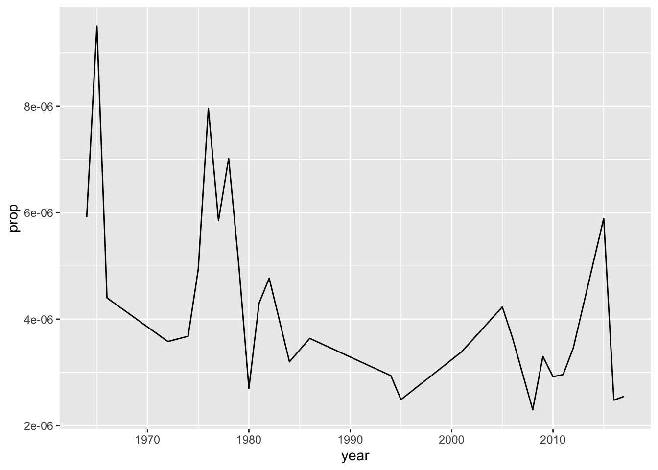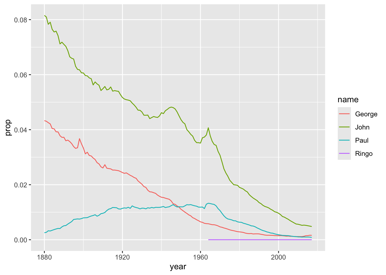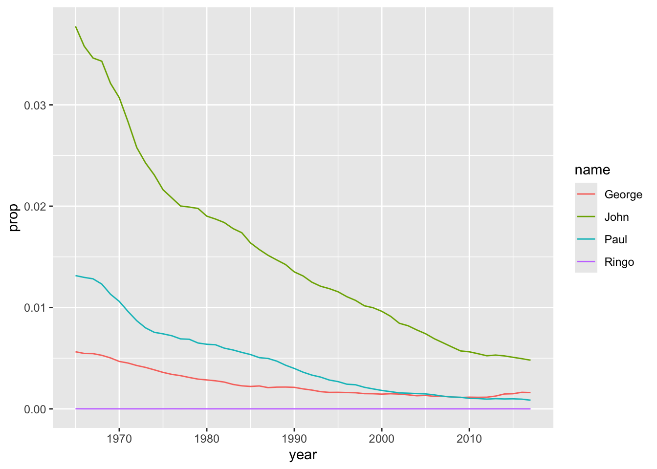 To review, we take ‘babynames,’ and filter so the names only include ‘Ringo;’ We then plot by setting the aesthetics to use the ‘year’ and ‘prop’ columns of our dataset; our plot will be a line chart.