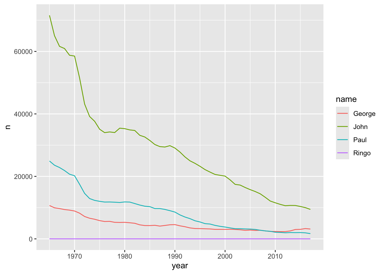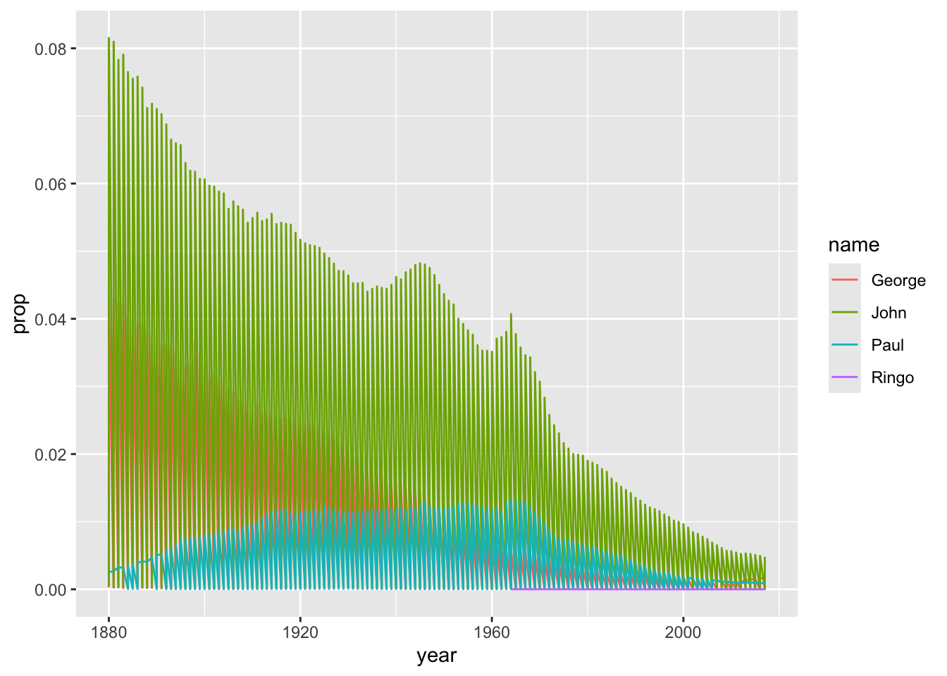 But the plot looks really weird! Why? In summary, because there is a ‘Sex’ column in the data. So, for any year - say, 1974 - there are 4 male Ringo’s, and zero female Ringo’s - ggplot is trying to plot both the 4 and 0 values on the same vertical axis.