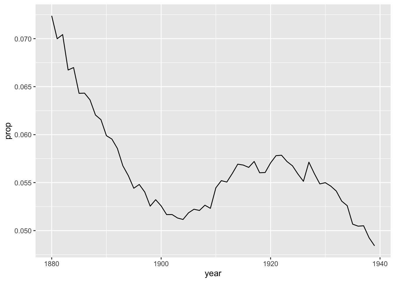 Why does Mary have a higher ‘n’ value, but a lower proportion - in the same year? Because ‘prop’ also takes sex into account, i.e. it counts the proportion of each sex in each year that receives a given name.